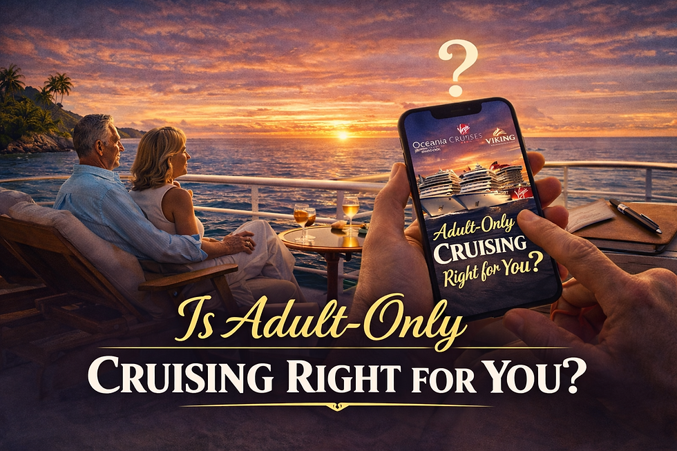 Adult-only cruising works best for travelers who value atmosphere as much as itinerary. It’s not one-size-fits-all — and that’s exactly why choosing the right cruise line matters. That’s also why working with a cruise specialist can make such a difference: matching the right traveler with the right cruise line is key.